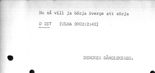 //// Nu så vill ja börja överge att sörja //// D 217 (ULMA 2002:2:42) //// ¦ //// Rr;'..... //// f) DENCKER SÅNGLEKSREG. //// \ _ ////