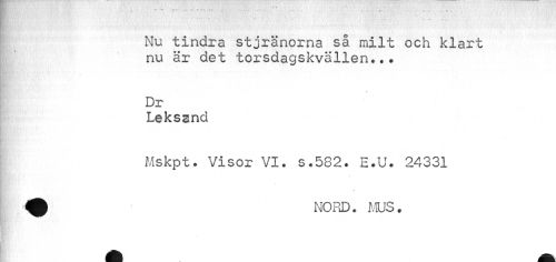 //// Nu tindra stjränorna så milt och klart nu är det torsdagskvällen... //// Dr //// Leksand //// Mskpt. Visor VI. s.582. E.U. 24331 //// » //// 9 NORD. MOS. ////