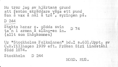 //// Nu tror jag av hjärtans grund //// att femton skräddareoväga ett pund //// Sax å vax å nål å trå'* syringen på. //// D 244 //// Stekta harar o* gödda svin q ta'n i armen å släng-en in. (allt som ihågkommes) //// Ur "Stockholms Folkminnen" bd.I s.631.Uppt. av C.H.Tillhagen 1939 eft. Fröken Siri Lindståhl född 1874. //// Stockholm D 244 //// NORD. MUS. ////
