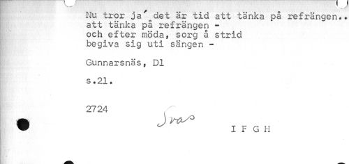 //// Nu tror ja'odet är tid att tänka på refrängen., att tänka på refrängen -och efter möda, sorg å strid begiva sig uti sängen - //// Gunnarsnäs, Dl //// s.21. //// < //// 2724 //// • J //// ^ IF GH ////