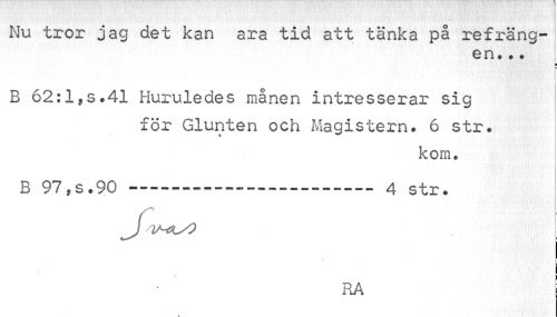 //// Nu tror jag det kan ara tid att tänka på refrängen.. • //// k //// B 62:l,s.41 Huruledes månen intresserar sig //// för Glunten och Magistern. 6 str. //// kom* //// B 97,s.90 ---- 4 str. //// ^J V^L/0 \ //// s //// . //// RA ////