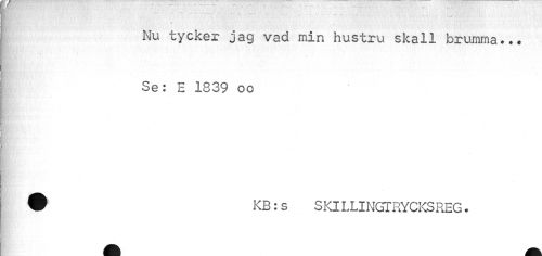 //// " ..... ....... - . ...... //// ' - . Nu tycker jag vad min hustru skall brumma... //// Se: E 1839 oo 9 KB:s SKILLINGTRYCKSREG. ////