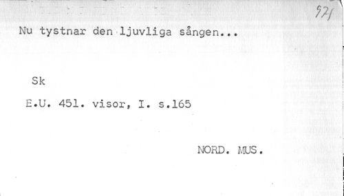 //// 7/j //// Nu tystnar den ljuvliga sången... //// ¦ //// //// /i //// I //// j //// i //// Sk i //// I //// r //// v //// E.U. 451. visor, I. s.165 j //// % //// NORD. MUS. //// • ¦ //// t //// t ////