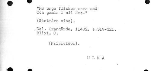//// "Nu unga flickor rara små Och gamla i all ära." //// (Skottårs visa). //// .Dal. Grangärde* 11482, s.319-321. Blixt, 0. //// (Friarvisor), //// » //// U L M A //// .AS bbi JH BÉ>. ^H Bik. ////