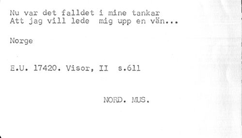 //// Nu var det falidet i mine tankar Att jag vill lede mig upp en vän... //// r //// I //// Norge j //// I //// c i //// E.U. 17420. Visor, II s.611 //// I //// i i //// NORD. MUS. //// ¦ ////