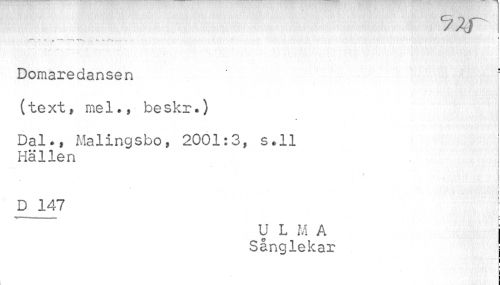 //// c/ zr //// y......: -T- . ..... ; //// \ I //// Domaredansen (text, mel., - be skr.) //// Dal., Malingsbo, 2001:3, s.ll Hällen //// i //// i i //// 1 j //// I //// i //// ! //// D 147 j //// k //// U L M A I //// Sånglekar i ////