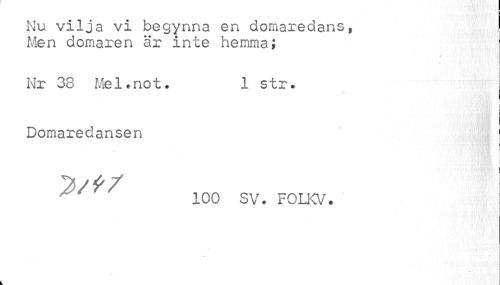 //// Nu vilja vi begynna en domaredans,, Men domaren är inte hemma; //// » //// Nr 38 Mel.not. 1 str. ! //// k //// | //// i i s //// Domaredansen //// //7 100 SV* FOLKV * 4 //// //// /