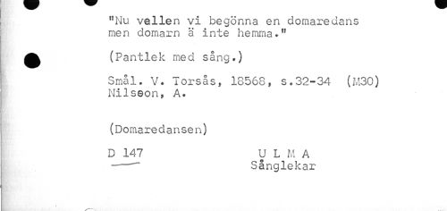 //// "Nu velien vi begönna en domaredans men domarn ä inte hemma." //// ^ (Pantlek med sång.) //// Smål. V. Torsås, 18568, s.32-34 (M30) Nilsson, A. //// (Domaredansen) //// D 147 ULM A //// *--~~ Sånglekar ////