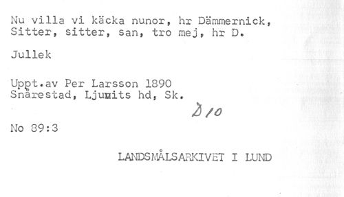 //// Nu villa vi käcka nunor, hr Dammernick, Sitter, sitter, san, tro mej, hr D. //// Jullek //// Upgt.av Per Larsson 1890 Snarestad, Ljunits hd, Sk. //// i /O //// No 39:3 //// LANDS MÅLSARKIVET I LUND //// * ////