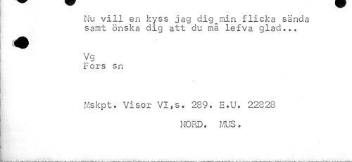 //// Nu vill en kyss jag digemin flicka sända //// samt önska dig att du må lefva glad... //// ¦ //// Vg //// Fors sn //// * //// Mskpt. Visor VI,s. 289. E.U. 22328 //// NORD. MUS. ////