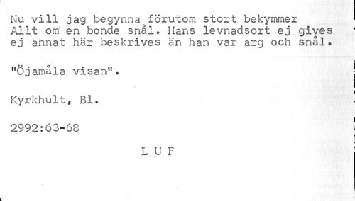 //// Nu vill jag begynna förutom stort bekymmer //// Allt om en bonde snål. Hans levnadsort ej gives f //// ej annat här beskrives än han var arg och snål. //// ..... i //// "Öjamåla visan". j //// i //// Kyrkhult, Bl. ! //// 2992:63-68 ! //// I //// c //// i //// L U F //// v //// i f ////