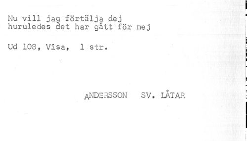 //// v //// Nu vill jag förtälja dej //// huruledes det har gått för mej I //// i //// i //// Ud 108, Visa, 1 str. j //// ANDERSSON SV* LÅTAR j //// t i i ////