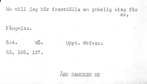 //// Nu vill jag här framställa en ynkelig visa för //// er, //// Fangvis 3l • //// 5:4. VÖ. Uppt. Wefvar. //// R3, 165, 127. //// « //// ÅBO RANCKEN MS ////