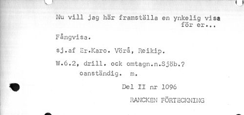 //// Nu vill jag här framställa en ynkelig visa //// för er * *• //// Fångvisa * //// sj.af Er.Karo. Vörå, Reikip. //// W.6.2, drill, ock omtagn.n.Sjöb.? //// oanständig, m. //// Del II nr 1096 //// RANCKEN FÖRTECKNING ////