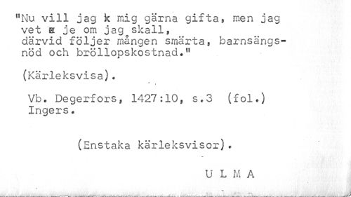 //// "Nu vill jag k mig gärna gifta, men jag vet e je om jag skall, //// därvid följer mången smärta, barnsängsnöd och bröllopskostnad." //// (Kärleksvisa}. //// Vb. Degerfors, 1427:10, s.3 (fol.) Ingers. //// (Enstaka kärleksvisor). //// U L M A //// •rr //// __ -f " j ////