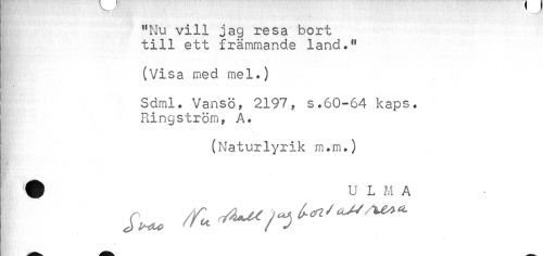 //// : .. ——-v. .r //// "Nu vill jag resa bort till ett främmande land." //// (Visa med mel.) //// é //// Sdml. Vansö, 2197, s.60-64 kaps. Ringström, A. //// (Naturlyrik m.m.) ////