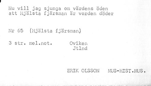 //// Nu vill jag sjunga om värdens öden att Hjälsta fjärsman är vorden döder //// Nr 65 (Hjälsta fjärsman) //// 3 str. mel.not. Oviken //// Jtlnd //// ERIK OLSSON MUS-HIST.MUS. ////