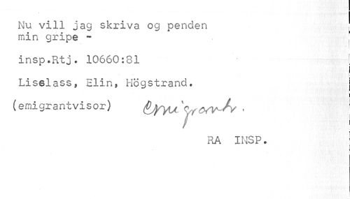 //// Nu vill jag skriva og penden min gripe - //// insp.Rtj. 10660:81 j //// i //// Liselass, Elin, Högstrand. j //// i //// (emigrantvisor) Syyu^d*V-A- • //// RA INS P. i //// ! ////