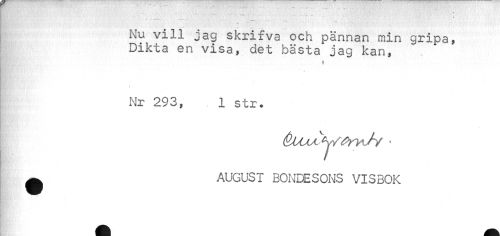 //// t //// •-- ..... //// Nu vill jag skrifva och pannan min gripa, Dikta en visa, det bästa jag kan, //// I //// HPf1 //// Nr 293, 1 str. //// •AUGUST BONDESONS VISBOK ////
