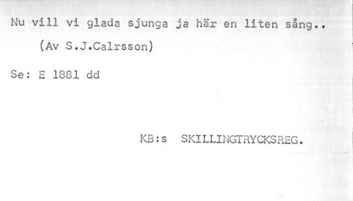//// Nu vill vi glada sjunga ja här en liten sång.. //// (Av S .J.Calrsson) ; //// Se: E 1881 dd //// i //// ' 'i ! //// ¦ //// KB:s SKILLINGTRYCKSREG. ////