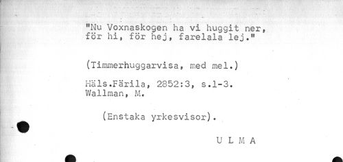 //// a //// sm, '?.: .1 i ".x. ' + ¦ Vi '¦'!''¦': • .V; /¦.'•» .'.,•' ¦.' V ','.; •' V ¦ t*' ' '".!• : ' .'•'. . r //// • • - • . • ^ //// ... * . //// "Nu Voxnaskogen ha vi huggit ner, //// för hi, för hej, farelala lej." //// //// /(Timmerhuggarvisa, med mel.) //// Häls.Färila, 2852:3, s.1-3. Wallman, M. //// (Enstaka yrkesvisor). //// U L M A //// t ////