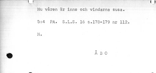 //// Jv • • i i _ //// Nu våren är inne och vindarna susa. //// 5:4 PA. S.L.S. 16 s.178-179 nr 112. N. //// ^ ÅBO ////