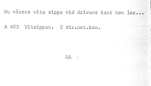 //// I //// Nu vårens vita sippa vid drivans kant hon ler... I //// A 403 Vitsippan. 2 str.not.kom. j //// i //// i //// RA v //// \ ////