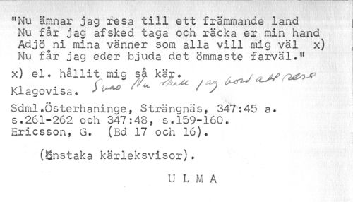 //// "Nu ämnar jag resa till ett främmande land Nu får jag af sked taga och räcka er min hand Adjö ni mina vänner som alla vill mig väl x) Nu får jag eder bjuda det ömmaste farväl." //// x) el. hållit mig så^ kär. ^J ^ ^ //// Kl a go vi sa. ' //// /Sdml.Csterhaninge, Strängnäs, 347:45 a. s.261-262 och 347:48, s.159-160. Ericsson, G. (Bd 17 och 16). //// (Enstaka kärleksvisor). //// U L M A ////