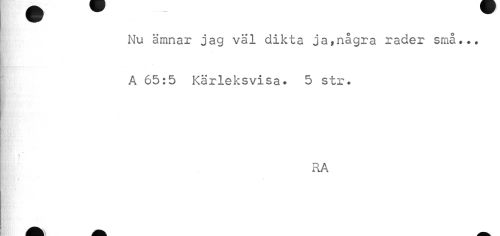//// Nu ämnar jag väl dikta ja*några rader små... A 65:5 Kärleksvisa* 5 str* //// i //// RA //// • • ////