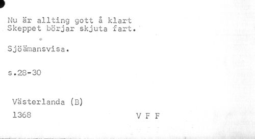 //// Nu ar allting gott å klart . Skeppet börjar skjuta fart.' //// Sjöamansvisa. //// s.28-30 //// Västerlanda (B) //// 1368 v F F //// «» ////