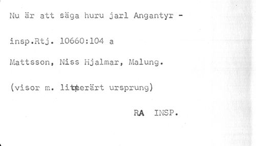 //// Nu är att säga huru jarl Angantyr - //// insp.Rtj. 10660:104 a Mattsson, Niss Hjalmar, Malung* //// (visor m* litterärt ursprung) //// RA INSP. //// //// /
