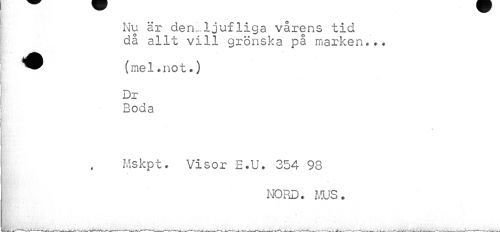 //// Nu är deruljufliga vårens tid då allt vill grönska på marken... //// (mel. not.) //// Dr Boda //// Mskpt. Visor E.U. 354 98 //// NORD. MUS. ////