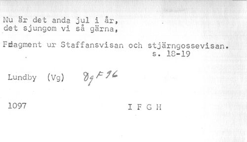 //// Nu är det anda jul i år, det sjungom vi så gärna, //// Frfagment ur Staffansvisan och stjärngossevisan. //// s? 18-19 //// « //// Lundby (Vg) df * u //// 1097 I F G H ////