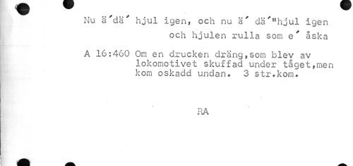 //// Nu ä'dä' hjul igen, och nu ä' dä'"hjul igen //// och hjulen rulla som e' åska //// A 16:460 Om en drucken dräng,som blev av //// lokomotivet skuffad under tåget,men kom oskadd undan. 3 str.korru //// RA ////