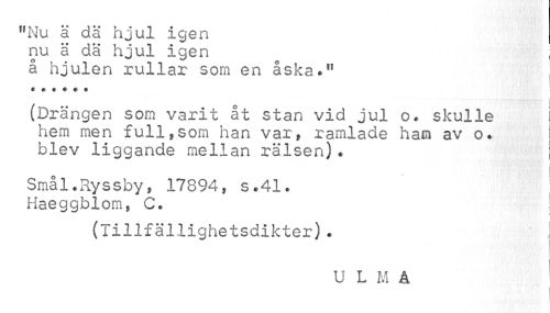 //// "Nu ä dä hjul igen nu ä dä hjul igen i //// å hjulen rullar som en åska." //// (Drängen som varit åt stan vid jul o* skulle S hem men full,som han var, ramlade han av o* blev liggande mellan rälsen). //// Smål.Ryssby, 17894, s.41. Haeggblom, C. //// (Tillfällighetsdikter). //// U L M A ////
