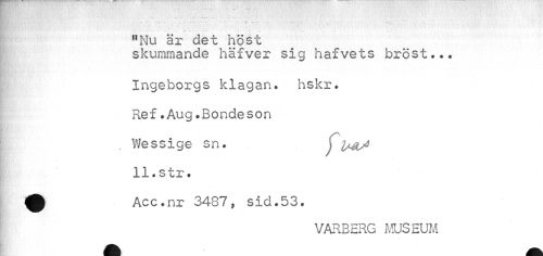 //// "Nu är det höst //// skummande häfver sig hafvets bröst... //// Ingeborgs klagan, hskr. Ref.Aug.Bondeson Wessige sn. j //// 11.str. //// 0 Acc.nr 3487, sid.53. //// VARBERG MUSEUM ////