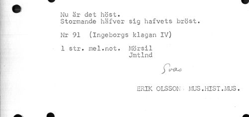 //// Nu är det höst. //// Stormande häfver sig hafvets bröst. //// Nr 91 (Ingeborgs klagan IV) //// 1 str. mel.not. Mörsil //// Jmtlnd //// ERIK OLSSON "i MUS .HIST .MUS . //// ^fl m A Jfl ////