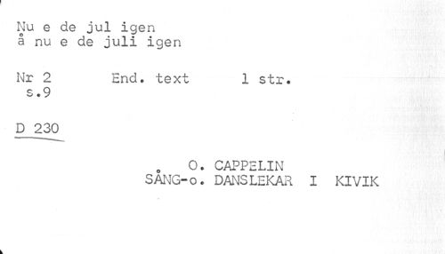 //// Nu e de jul igen å nu e de juli igen //// Nr 2 End. text 1 str. //// s.9 //// D 230 //// O. CAPPELIN SANG-o. DANSLEKAR I KIVIK ////