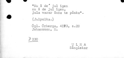 //// nNu ä de' jul igen //// nu ä de jul igen, //// jula varar änna te påska11* //// järn //// (Julpolka.) //// Ögl. Örberga, 4183, s.23 Johansson, H. //// 230 //// U L M A //// Sånglekar //// i1"'''1 J'*' \ ' ' .'i .'<'' • ¦ ¦¦ \ ////