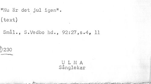 //// l!Nu är det jul igen", (text) //// i //// Smål., S.Vedbo hd., 92:27,s.4» 11 230 //// ULMA Sånglekar //// ____ _____ _ _ . .. _ .-^-w. . ...JJW^^.hTVX^--Lk -._____--- ////