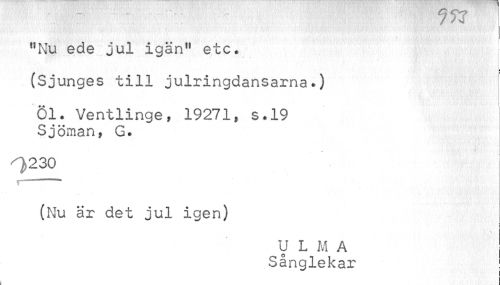 //// ~ - ; ~ 7 //// "Nu ede jul igän" etc. (Sjunges till julringdansarna•) //// "Öl. Ventlinge, 19271, s.19 Sjöman, G. //// ^230 //// (Nu är det jul igen) //// U L M A Sånglekar //// i ////