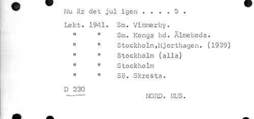 //// ^ Nu är det jul igen . . . . 5 . //// Lekt. 1941. Sm. Vimmerby. //// • * //// " 11 Sm. Konga hd. Almeboda. 11 11 Stockholm,Hjorthagen. (1939) 11 11 Stockholm (alla) //// 11 11 Stockholm //// " " Sö. Skresta. //// D 230 //// —--NORD. MUS . ////