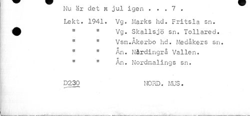 //// ^ Nu är det jul igen . . . . 7 . //// Lekt. 1941. Vg. Marks hd. Fritsla sn. //// 11 11 Vg. Skallsjö sn. Tollared. //// " " Vsm.Åkerbo hd. Medåkers sn. //// n 11 Ån. Nårdingrå Vallen. //// 11 11 Ån. Nordmalings sn. //// D230 NORD. MUS. ////
