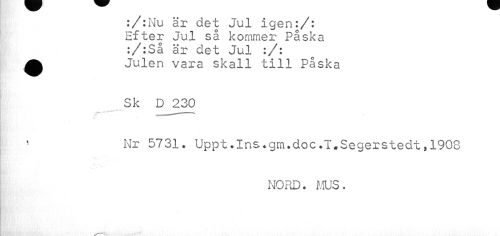 //// :/:Nu är det Jul igen:/: Efter Jul så kommer Påska :/:Så är det Jul :/: ^ Julen vara skall till Påska //// Sk D 230 //// ' Nr 5731. Uppt.Ins.gm.doc.T.Segerstedt,1908 //// NORD. MUS. ////