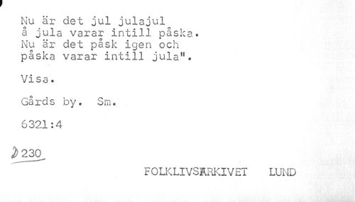 //// Nu är det jul julajulo å jula varar intill påska. Nu är det påsk igen och påska varar intill jula". //// Visa. //// Gårds by. Sm. 6321:4 //// 2) 230 //// F O LKLIVSRRKIV ET LUND ////
