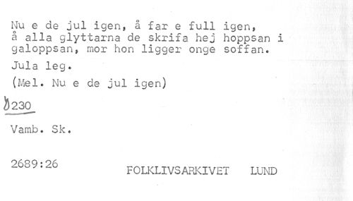 //// Nu e de jul igen, å far e full igen, å alla glyttarna de skrifa hej hoppsan i galoppsan, mor hon ligger onge soffan. //// Jula leg. //// (Mel. Nu e de jul igen) i 230^ Vamb. Sk. //// 96R9•96 //// FOLKLIVSARKIVET LUND ////