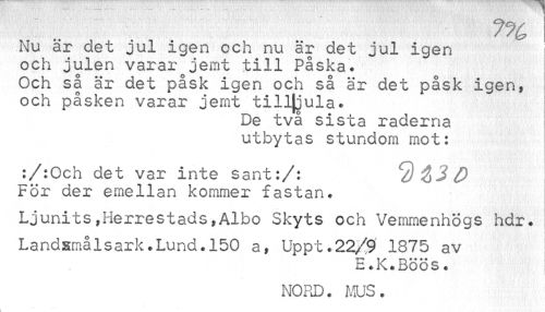 //// Nu är det jul igen och nu ar det jul igen //// och julen varar jemt till Påska. //// Och så är det påsk igen och så är det påsk igen, //// och påsken varar jemt till|jula. //// De två sista raderna utbytas stundom mot: //// :/:Och det var inte sant:/: ^ O //// För der emellan kommer fastan. //// Ljunits,Herrestads,Albo Skyts och Vemmenhogs hdr. //// Landsmålsark.Lund.150 a, Uppt.22/9 1875 av j //// E.K.Böös. //// NORD. MUS. ////
