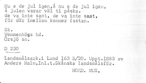 //// Nu e de jul igen,å nu e de jul igen, å julen varar väl ti påska. //// de va inte sant, de va inte saat, för där imellom kommer fastan. //// Ok t > //// Vemmenhögs hd» Örsjö sn. //// D 230 //// . - //// Landsmålsark.i Lund 163 B/20. Upgt.1883 av Anders Malm,Inl.t.Skånska landsmalsför. //// NORD. MUS. ////