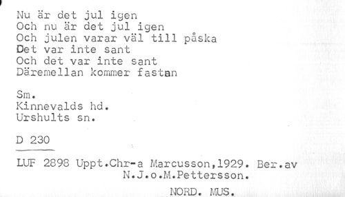 //// Nu är det jul igen //// Och nu är det jul igen //// Och julen varar väl till påska //// Det var inte sant //// Och det var inte sant //// Däremellan kommer fastan //// Sm. //// Kinnevalds hd. Urshults sn. //// D 230 //// LUF 2898 Uppt#Chr-a Marcusson,1929. Ber.av //// N.J.o.M.Pettersson. //// NORD. MUS. ////