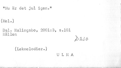 //// "Nu är det jul igen." //// v : • I //// (Me 1.) //// Dal. Malingsbo, 2001:3, s.101 Hällen //// fiUb //// i //// (Lekmelodier.) //// U L M A ////